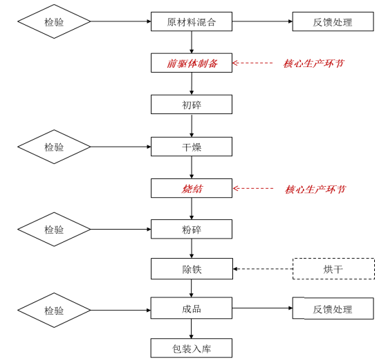 粉碎环节:将烧结出来的物料管道输送至气流磨中,利用设备的高温高压空气使物料间相互碰撞研磨,直至合格出料,所用主要设备为气流磨、br/>