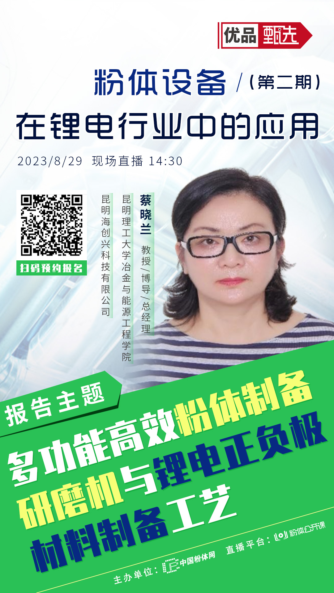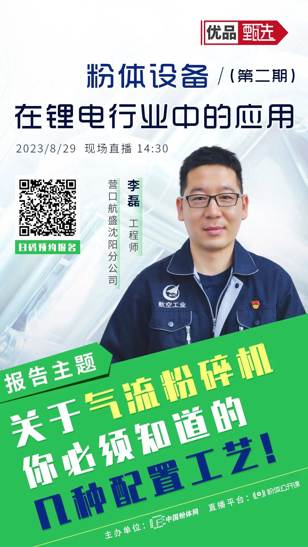 为更好地服务锂电产业链企业,助力用户便捷选型,快速采购理想的生产装备!粉体公开课将亍strong>8?9号下?点半开启第2期优品甄选直播专?-粉体设备在锂电行业中的应用,邀请行业内优秀设备品牌商做设备展示,为用户全面的了解产品优势,使用方法和技巧等,多方位考察、/p>
