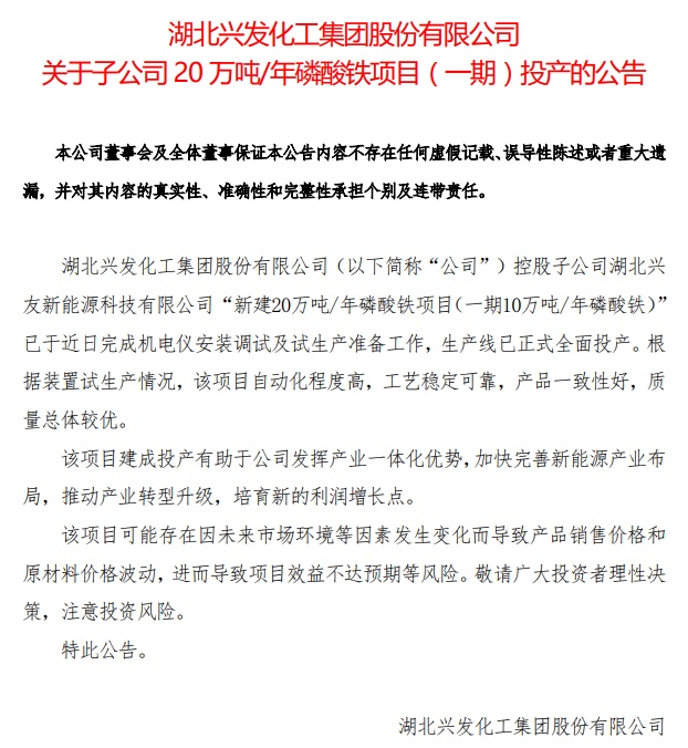 中国粉体网讯9?日,兴发集团发布公告,控股子公司湖北兴友新能源科技有限公司“新?0万吨/年磷酸铁项目(一?0万吨/年磷酸铁)”已于近日完成机电仪安装调试及试生产准备工作,生产线已正式全面投产。根据装置试生产情况,该项目自动化程度高,工艺稳定可靠,产品一致性好,质量总体较优、br/>