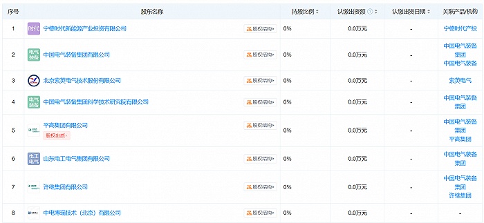 据天眼查APP信息显示,中国电气装备储能由宁德时代新能源产业投资有限公司、中国电气装备集团有限公司(下称中国电气装备)、山东电工电气集团有限公司、许继集团有限公司等八家公司共同持股。持股具体数据尚未披露、br/>