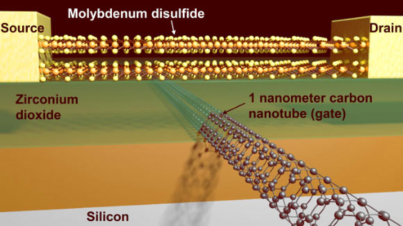 选定二硫化钼作为半导体材料后,接下来就需要来建造栅极。但制速/span>1纳米的结构并不是一件容易的事,传统的光刻技术并不适用于这样小的规模。最终,研究人员转向了碳纳米管,直径仅为1纳米的空心圆柱管、/span>