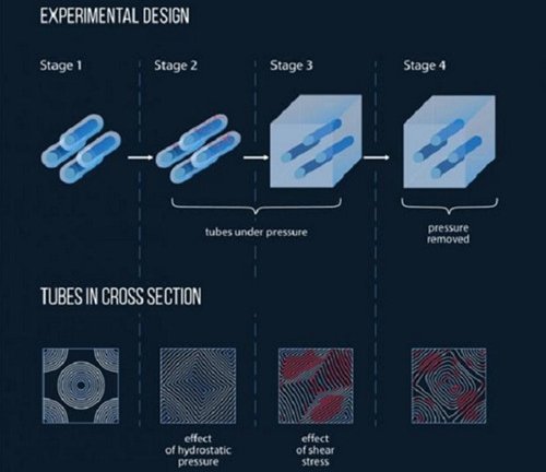 科学家们通过电脑模拟,已经发现这两种压力可以以不同的方式影响纳米管的结构。静力学压力通过复杂的方式来改变纳米管的管壁几何结构,然而剪切力会引起外壁无定型区域发生sp3杂化,通过共价键来把它们和附近的碳纳米管结合在一起。当压力除去时,被连接的多层纳米管的内层形状又恢复如初、/p>