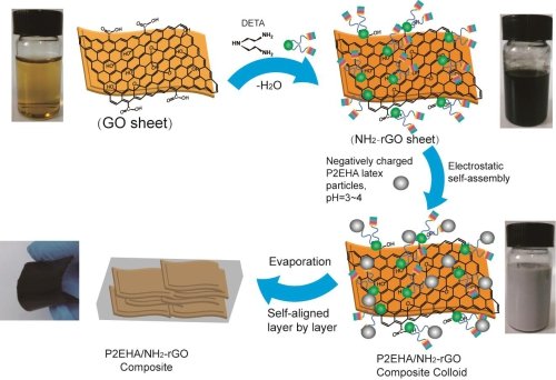?.二乙基三胺(DETA)同步氨基化还原氧化石墨烯以及其与带相反电性的乳液颗粒之间的静电自组装流程图、/strong>