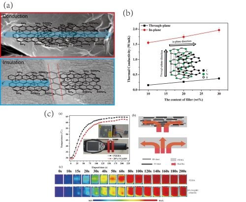 ?.(a)六方氮化硼@功能化石墨烯结构示意图;(b)复合材料导热性能示意图;(c)模拟复合材料在实际电子器件中的散热效果、/strong>