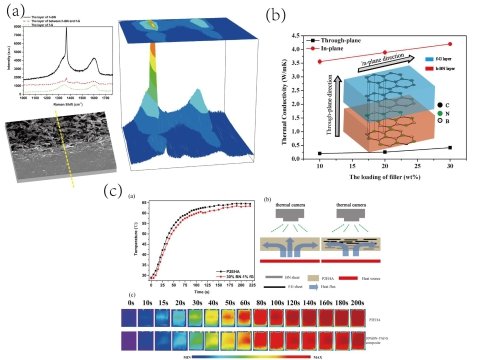 ?.(a)六方氮化硼和功能化石墨烯所形成的双层结构拉曼图;(b)复合材料导热性能示意图;(c)模拟复合材料在实际电子器件中的散热效果、/strong>