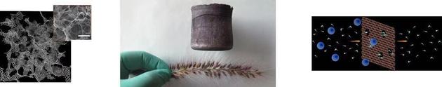 我们看中间这张图,就是用石墨烯组成了一个泡沫状的结构,它可以自己把自己支撑起来,但非常非常的轻。我们把它放在一个狗尾草上面,狗尾草看上去没有任何的结构上的变化、/p>