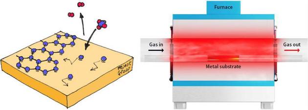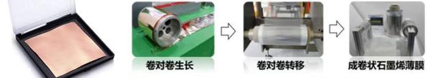 我们把它放到一个炉子里面,在高温条件下可以做成小单片,也可以通过卷对卷的方式长成大的石墨烯薄膜、/p>
