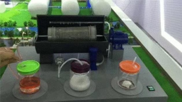 在我们最左边的这幅图里面是一个水、油、悬浮物混合的溶液,然后它进入这个机器以后分出来的中间的是纯水或者处理后的比较干净的水,右边橘色的是油,另一个管道出现的是固态颗粒。右边我们看到它可以做成一个整机,就可以真正地去处理水了、/p>