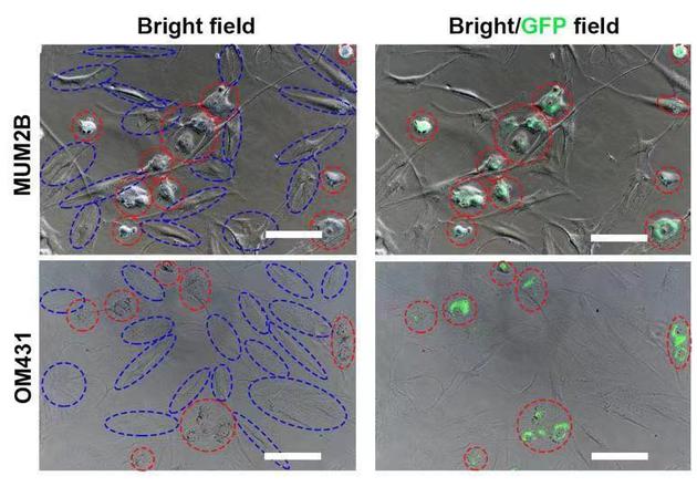 用石墨烯做的示踪原子非常好,我们看左边这个图,用石墨烯看到的癌细胞是绿的,它不染色这个正常的细胞,我们就看到癌细胞是怎么变化的、/p>