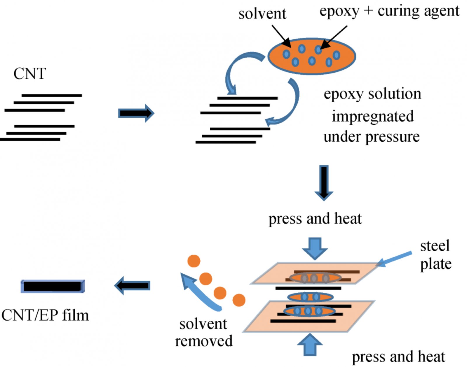 中国粉体网讯近日华东理工大学机械与动力工程学院陈恒课题组和上海空间电源研究所徐建明等人,基于碳纳米管(CNT)组件的生产,开发了一种用于制备具有高拉伸强度和导电性的CNT /环氧(EP)复合膜新技术。CNT通过浮动催化剂喷雾热解合成。在自组装成空心圆柱形组件后,将CNT拉伸并缠绕在旋转鼓上以形成均匀的CNT膜。使用不同浓度的EP树脂溶液在不同压力下填充膜内的孔隙,并在热压固化后形成复合膜。通过改变EP树脂溶液的浓度和用于浸渍的压力来研究EP树脂的渗透性及CNT和EP树脂之间的界面粘合度。在最佳制备条件下,复合薄膜中CNT的质量分数高?9%,分别比纯CNT膜高159%和309%、br/>