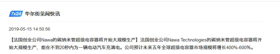 据Nawa Technologies公司表示,目前全球超级电容器市场规模约为5.6亿美元,但预计未来五年将增长400%-600%。而随着碳纳米管超级电容器将开始大规模生产,映射国内碳纳米管相关企业也有望因此受益、br/>