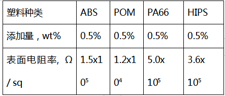 可见其超低添加量下可以达到高导电性的特点,在不同塑料种类都能适用,具有广泛性和普适性,不受基材限制,在大部分塑料里,添加千分之几就可以达到导电性。而且能耐高温、不迁移、耐水洗、不受环境湿度影响,具有永久性效果、br/>