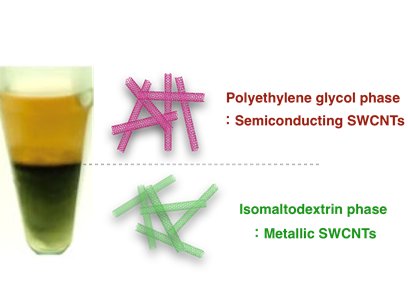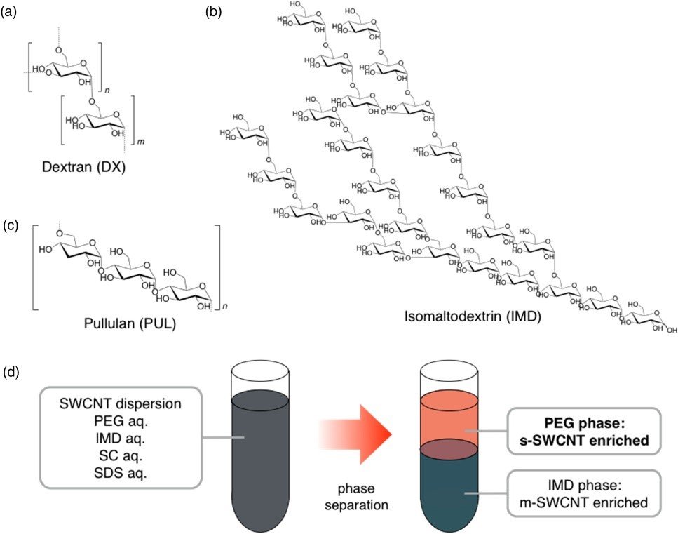 单壁碳纳米管(SWCNT)具有出色的电子和机械性能,使其成为广泛用于包括LCD显示器中的薄膜晶体管在内的各种电子设备的理想选择。问题在于,只部分制造出的SWCNT适用于电子设备。有用的半导体型SWCNT必须与金属型SWCNT分开。但是,目前最有效的两相萃取净化方法需要使用成本较高的dextran多糖、/p>
