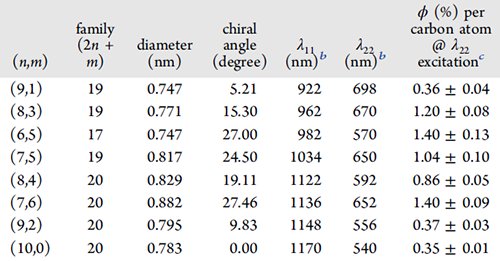 ?:不同手性碳纳米管的结构参数和每个碳原子荧光量子效率、/p>