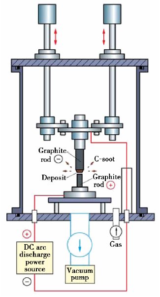 电弧放电法是制备纳米材料常用的方法之一。在采用电弧法制备纳米材料过程中,随着电流增加,极间电压减小,弧柱电位梯度降低;弧柱电流密度升高,且极斑电流密度更高。最早采用电弧法制备的碳纳米材料是富勒烯。由于该方法所制备的碳纳米材料的缺陷少、纯度高,逐渐被用来制备碳纳米管、碳纳米角、石墨烯等碳纳米材料。其反应装置示意图如下: