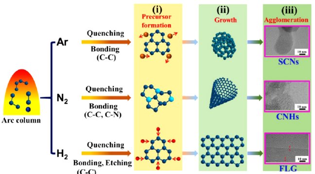 电弧放电的本质是通过气态带电粒子导电完成传质传热。不同的反应气氛对碳纳米管的生长具有重要影响。引弧气体的选择主要取决于电离式、导热性以及导电性。目前,最常用的引弧气体主要是氢气、氮气、氦气与氩气。其中,氢气导热性最高,且对碳纳米管生长的淬火效果最佳、/p>