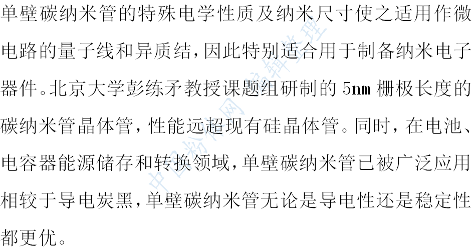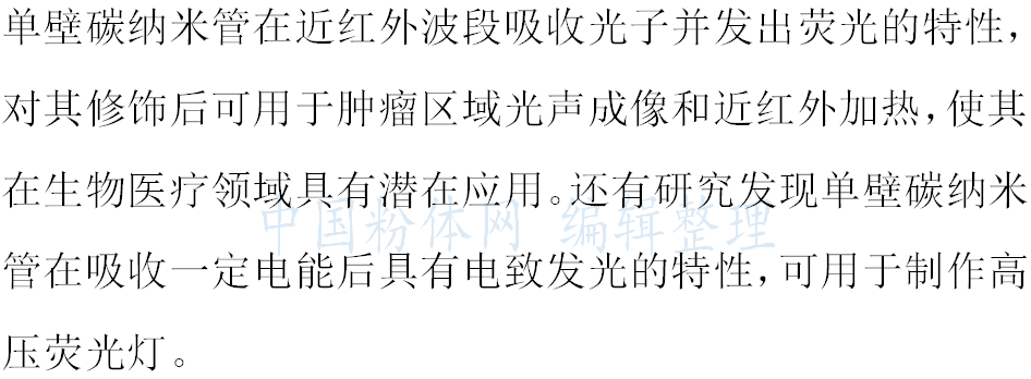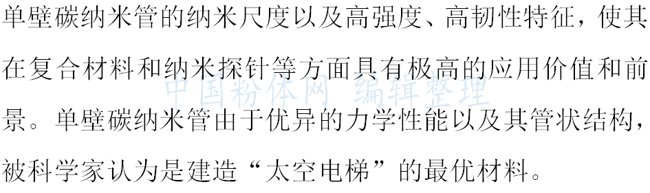中国粉体网讯单壁碳纳米管作为最具代表性的一维纳米材料,具有许多优异的物理化学性能。随着对单壁碳纳米管基础和应用研究的不断深入,其在很多领域都展现出广阔的应用前景,包括纳米电子器件、复合材料增强剂、能源储能介质、催化剂和催化剂载体、传感器、场发射器、导电薄膜和生物纳米材料等等,其中一些已经实现了工业应用、br/>