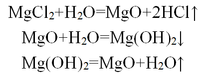 将卤水浓缩到一定浓度后,直接喷入到热分解反应炉中,?00℃~1000℃进行热分解产出粗制MgO。粗制MgO经水洗除去可溶性氯化物,并使粗制MgO完全转化为Mg(OH)2,再?600℃~2000℃煅烧生成高纯MgO。其工艺原理为: