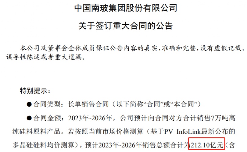 但南玻A强调,该测算不构成价格或业绩承诺,具体订单价格月议,合同交易总额以最终成交金额为准。公司称,本合同的签订有利于公司高纯硅料产品的稳定销售,符合公司未来经营规划,将对公司未来经营业绩产生积极影响,该业务合作不会对公司目前经营业务产生重大影响、/p>