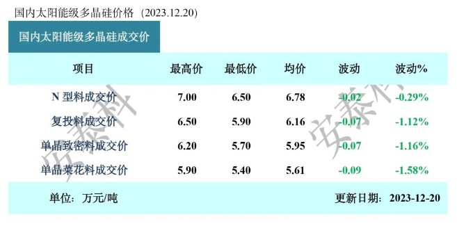 下半年来,硅料价格持续走跌?2?0号,硅料分会公布最新硅料价格,n型硅料成交区间在6.5-7万元/吨,成交均价?.8万元/吨,环比下降0.29%;单晶致密料成交区间?.7-6.2万元/吨,成交均价?.95万元/吨,环比下降1.16%。本周n型硅料价格维持平稳,p型硅料价格有轻微下滑,且p型硅料中的高-低品质价差有进一步扩大的趋势,低品质p型料的价格持续探底、/p>