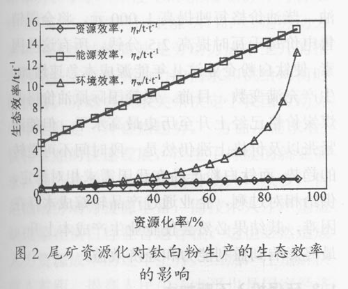 尾矿资源化对钛白粉生产的生态效率的影响 由图2可知,提高选钛尾矿等废弃物的资源化率,可以提高钛白粉生产的资源效率、能源效率和环境效率。并且,在一般情况下(资源化效率小?0?,随着资源化率的增加,能源效率的增加最为迅速,环境效率次之,资源效率增加相对缓慢 5结语 从产业生态学的角度界定了企业生产的产品,在生态效率理论的基础上定义了钛白粉生产的资源效率、能源效率和环境效率。对某典型钛白粉生产企业的生态效率的计算和分析表明,硫酸法生产钛白粉工艺中,能源效率最高。在现有的生产工艺水平下,大部分的输出物料未加利用,作为废弃物直接排入环境,使得钛白粉生产的资源效率和环境效率低下。钛白粉厂与其它厂家形成物质交换是降低其生产过程的环境负荷的重要途径之一。对计算结果的讨论表明,在一定的生产工艺下,通过尾矿的复选和回收利用可以提高生产的生态效率,尤其是能源效率。当然,利用生态效率指标分析生产效率时,收集的生产过程的物料清单越完备,数据越准确,计算结果越可靠