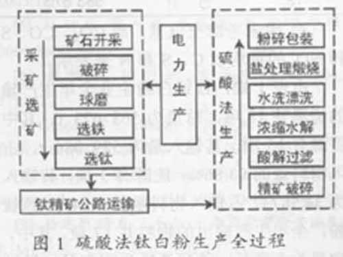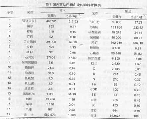 硫酸法钛白粉生产全过 根据质量守恒定律,以某工业活动为中心考虑所有进出该工业活动的物流和能流的收支分析,称为工业代谢分析。本文通过工业代谢分析,建立了上述钛白粉生产的输入输出清单(见表1),其中采选和硫酸法阶段的数据主要通过实地调研和计算得到,电力生产和公路运输的数据从文献得到