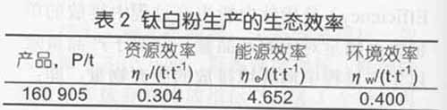 ?的前18项为参与工业代谢的各项物料,?9项为物料的合.对表1作如下说明: 1)在工业活动的全部代谢过程中,水和空气约占95%,其余“物?约占5%,它们之间比例相差悬殊,势必影响对物料的代谢分析。钛白粉生产的物质代谢过程也是这样的,仅水的消耗量就占输入资源总量?0%左右,通常对其进行单独的代谢分析。所以,本文不考虑空气和水的代谢 2)该企业每年外购电1?×1 07 kWh。参照文献中,将生产1?×1 07 kWh电力所消耗的煤炭、柴油、汽油和产生的灰、粉尘、电渣、C02、CO、S02、NOx等叠加到钛白生产的相关物料中 3)因未考虑空气量,故C02、CO、SO,和NOx的量均以C、S和N来表示 由表l知,该钛白粉企业全年生产输入的物料共18项,总量? 63 673 t。其中,资源? 5项,其输入量?29 086 t,占输入物料量的93? 6%;能源?项,其输入量? 4 5 8 7 t,占输入物料量的6? 4%。该钛白粉厂全年生产输出的物料共1 7项。其中,钛白粉为主产品,硫酸亚铁为副产品,铁精矿将直接用作钢铁生产。这3项加在一起,得输出的“产品’’量? 60 905 t,占输出物料量的2 8? 7%;其余输出为废弃物,共1 4项,总量?02 424 t,占输出物料量的7 1?3% 根据钛白粉生产的生态效率指标定义,计算其资源效率、能源效率和环境效率,结果如?所示 钛白粉生产的生态效 4分析与讨 4?钛白粉生产的生态效 钛白粉生产的生态效率指标由高到低排列为:ηe>ηw>ηr(见表2)。可见,该钛白粉企业在生产过程中,资源浪费严重,由此引起的环境负荷较为突出。除主产品钛白粉以外,仅有占输池总量26?9%的铁精矿和硫酸亚铁被其它企业或生产过程使用,占输出总量71?3%的物料均为排入环境的废弃物;同时,该企业钛白粉的生产几乎完全依赖于天然资源,没有废弃物作为回收资源,致使该厂的资源效率和环境效率较低