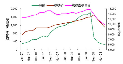 2008年,对中国钛白粉市场来说是内忧外患的一年,美国著名的增长咨询公司Frost & Sullivan(弗若斯特沙利文)持续关注该市场,认为中国钛白粉市场目前正处于行业整合的初级阶段,落后产能淘汰以及提高行业整体生产技术水平是行业未来发展的必然趋势 据统计,2008年中国钛白粉全年产量78.7万吨,较2007年大幅下降约21.1%,市场表观消费?6.3万吨,较2007年下跌约15.2%。硫酸等原材料价格在前三个季度的大幅上涨促使行业整体盈利水平大幅下探,与此同时,全球金融危机又使得主要下游行业如油漆涂料、塑料产品等的客户需求增速放缓,这两大因素共同作用直接导致了行业整体需求量下滑 纵观当前中国钛白粉行业,低端产能重复建设严重、生产成本压力巨大、环保治理成本较高以及高端产品自给率偏低仍旧是整体行业面临的主要问题。这些问题成为整个行业长期健康发展过程中面临的巨大挑战 低端产能重复建设严重,行业面临生产过 目前,由于生产技术基本被国外企业所垄断以及企业资金实力有限等问题,我国钛白粉生产企业基本采用硫酸法,且产能十分分散,相当比例的企业的生产能力不?万吨。目前仅有锦州钛业采用氯化法,然而由于技术以及生产规模等问题,该装置盈利情况始终较差,且产品质量相较国外氯化法产品质量也有一定差距。而在产品种类上,近年来金红石型钛白粉比例逐步提升?008年国内金红石型钛白粉销售量约占钛白粉总销量的58%,然而全球金红石型的比例高达87.5%,我国水平与国外仍旧有较大差距 Frost & Sullivan的研究显示,截至2008年年底,我国钛白粉行业总产能高?45万吨,产能过剩现象已经有所突显,加之第四季度众多钛白粉生产企业由于下游需求低迷以及生产成本难以负荷等原因纷纷限产或限产,全年平均开工率仅有54.3%。然而,目前各地仍有许多处于立项、报批、设计、施工等不同阶段的钛白粉新建项目,据不完全统计,这些新扩建项目的总产能高?30?40万吨,若这些项目全部能够顺利通过审批且按时投产,在不久的将来中国将超过美国一跃成为全球第一大钛白粉生产国。而面临产能的快速扩张,下游需求却不能及时跟进,产能过剩的问题将愈加严重 在这些新扩建产能中,几乎所有的产品均为金红石型产品,这意味着未来中国金红石型钛白粉的比例将会快速提高。然而这些装置采用的仍多为相对较为落后的硫酸法,中低端产能的重复性建设问题十分突出。而今年年初提出的十大行业振兴规划中,淘汰落后产能、加快企业整合也是国家当前针对化工行业的主要政策之一,钛白粉行业在这项政策的影响下,势必将加速行业整合的整体进程 原材料成本压力难以转嫁,行业盈利水平大幅下降 近年来,硫酸、钛铁矿、钛渣等原材料成本呈现直线上扬走势,?008年原材料价格更是急剧上涨接连突破历史高位,钛白粉生产企业虽然也同步上调产品售价,但是却无法将生产成本的上涨完全转嫁到终端用户,行业整理盈利水平严重受到挤压,2008年众多生产企业,特别是规模较小、生产技术落后的公司,亏损状况严重。同时,从安纳达、攀渝钛业和中核钛白这三家钛白粉上市公司年报及季报也可发现,2008年这三家公司整体盈利情况也不容乐观,2009年第一季度该三家公司的经营状况仍旧没有明显好转 进入2009年,虽然硫酸等原材料价格回落至低位,行业整体盈利状况?008年有所好转,然而由于钛白粉产品价格也处于较低水平,行业利润仍旧偏低。而随着今后新扩建装置的陆续投产,行业内价格竞争也将日益激烈,这也将直接影响到行业整体的利润水平