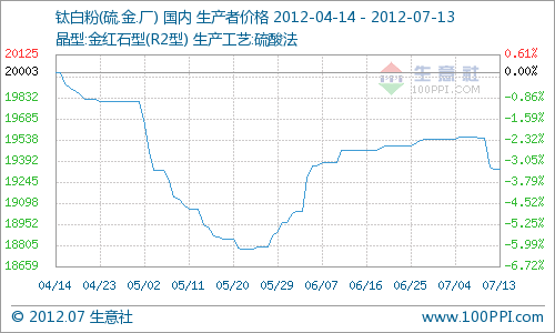 以国内市场走货量较大的硫酸法金红石型钛白粉为例,由图中可以看出,本周(7?-13?钛白粉价格总体出现回调,从本周一?9553?吨到周末?9331?吨,跌幅?.13%,生产商价格高位僵持开始松动 二、市场分 原料钛精矿价格略有缓解,钛白粉价格市场逐步开始理性回调 本周,攀枝花地区钛精矿价格略有解冻,目前品位46报价1950-2000??不含?之间,最低成交价可至1920??不含?左右。备受关注的越南A矿报价僵持在2450-2550??不含?,市场出货情况并不乐观,受越南事件影响,商家惜售心态浓厚,且对后市多为看多 本周钛白粉主要受下游需求疲软影响,价格市场略有回调。目前硫酸法金红石型和锐钛型主流报价维持?8500-19500?吨和15500-165000??均含?。下游涂料行业等的需求下挫,直接导致钛白粉行业销售欠佳,钛白粉生产商纷纷降价救市,调价幅度在200-1000?吨之间。进口原料矿价格高位悬停,下游需求的持续乏力,钛白粉生产商处境较难,而目前价格仍处高位的生产商更为被动,压缩利润提高销售量、尝试外贸出口或许是现阶段最好的选择 三、后市预 主要受原料钛精矿价格高位与下游需求疲软影响,生意社化工分社钛白粉分析师杨逊认为:时下已进入钛白粉市场的传统淡季,终端需求欠佳,本周的钛白粉市场更是?月以来再迎降价,预计短期内钛白粉市场或以理性回调为主,另外还要看龙头企业的价格走势,和在其影响下的价格刺激 相关上市公司:攀钢钒钛[000629]、安纳达[002136]、佰利联[002601]、ST钛白[002145]