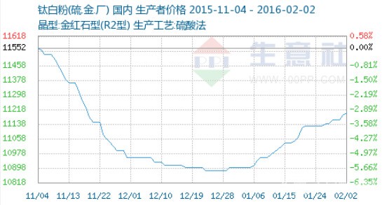 根据海关总署提供统计数据?015?2月我国钛白粉出口55586.362吨,同比增长27.05%,环比增?9.88%?015?-12月钛白粉总出?38394.44吨,同比减少2.55%,其中四川龙蟒累计出?.77万吨,一定程度上帮其消化不少库存,如此大量的出口主要源于11月其最新的低价政策,重回国际市场价格优势行列。目前国内多数硫酸法金红石型和锐钛型钛白粉的主流报价?300-10600?吨和8300-9500??均含?,价格跨度增大。生意社化工分社钛白粉分析师杨逊认为:钛白?016年开局两连涨,农历新年前的利多开道,涨价期或横跨春节,市场整体涨价多气氛较浓,后市或有生产商陆续跟涨,预计幅度在300?吨左右,但持货商的实单价格普遍执涨灵活,短期看,实单市场依然是看单、看量、看付款形式的一单一议为主!