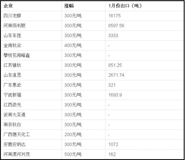 首先?015年下半年大宗商品行情低迷,钛白粉市场价格同样一路连创新低,虽然下游厂商开工并不乐观,需求方面也持续疲软状态,市场整体交投气氛欠佳,但在长期低价走货策略影响下,企业亏损严重,多数企业利润倒挂,挺价意向明显。而近期伴随行业龙企第三次涨价,目前已有十几家企业跟涨,涨幅大多维持在300?吨,目前市场成交价格仍在反应当中 其次,从上表可以看出,在2015年四季度末以?016?月国内钛白粉出口明显拉升,虽然由于人民币贬值影响,出口均价延续下跌走势,但国内企业出口稳健,在目前国内需求难以提振的前提下,缓解企业库存压力,目前国内主流企业库存均维持正常水平,更有部分企业库存偏低,这也成为推动企业涨价另一有利因素 国内钛白粉行业产能过剩问题突出,目前行业开工维持在55%左右水平,市场供应充足,供需格局面临较大困境,在国家供给侧改革不断落实过程中,提倡行业兼并整合,促进落后产能退出,钛白粉行业或将面临较大洗牌,同时房地产行业不断利好刺激,终端需求方面或将缓慢恢复,短期内钛白粉市场价格继续下跌空间有限,仍旧延续弱势窄幅波动,整体行情大稳小动,预?016年市场价格或将呈现缓慢窄幅上涨态势?季度国内金红石型钛白粉市场主流价格或将参?0000-11200?吨,锐钛型钛白粉出厂商谈或将?900-9900?吨