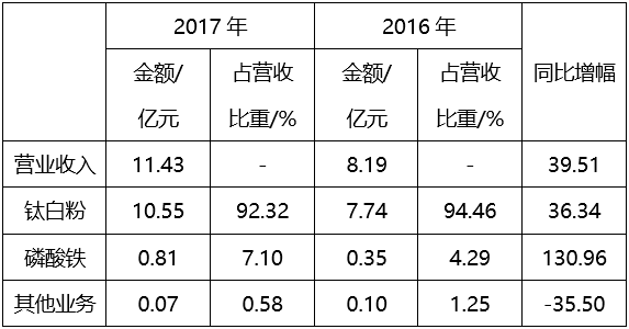 公司主要从事钛白粉产品的生产和销售,主要产品为钛白粉系列产品。公司控股子公司铜陵纳源从事磷酸铁产品的生产和销售,主要产品为磷酸铁系列产品、/p>