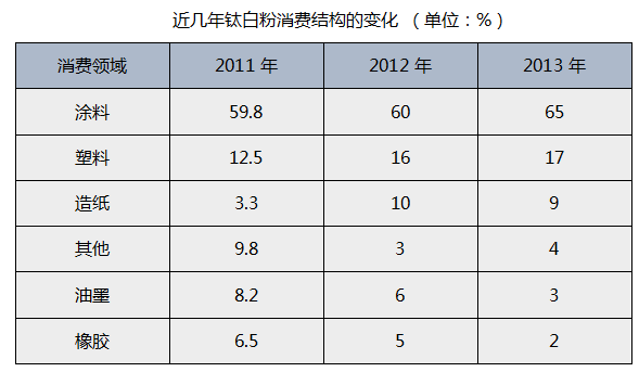 近几年,钛白粉的消费结构在发生变化,在涂料和塑料中的占比提高,造纸行业也有所增长,涂料、塑料和造纸仍是钛白粉消费的三大主力。近几年来,受欧洲绿色壁垒和美国反倾销影响,国内轮胎出口受阻,钛白粉在橡胶领域用量大幅度降低、br/>