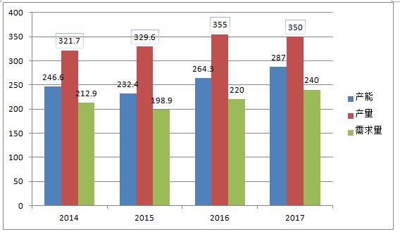 2014-2017年我国钛白粉市场行情(单位:万t(/p>