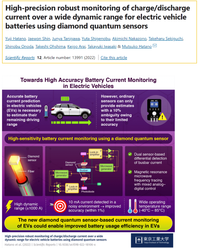 东京工业大学研究人员提出了一个解决电动汽车低效的方案。在《科学报告》(Scientific Reports)上发表的研究中,该团队报告了一种基亍strong>金刚石量子传感器的检测技术,该技术可以在测量电动汽车大电流时,以1%的精确度估计电池电量、/p>