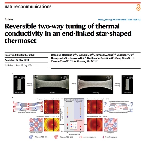 近日,麻省理工大学陈刚、赵选贺和林少挺团队研究介绍了一种新型的聚合物热开关。这种热开关由四臂聚乙二醇聚合物组成的末端连接星形热固性材料(ELST)制成,这种ELST通过机械拉伸和释放展示了快速、可逆和循环的热导率调节能力,末端连接的星形热固性材料在60°C的固定温度下热导率从0.15增加?.1 W/(mK)达到了应变调制?1.5、/p>