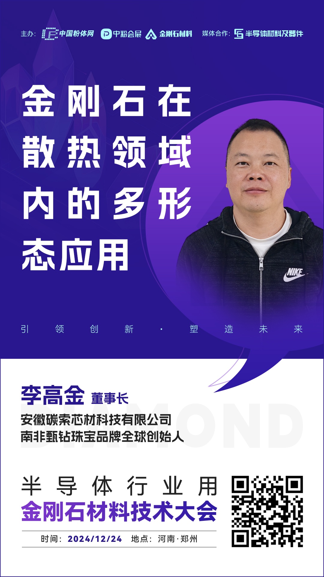 2024?2?4日,中国粉体网将?/span>河南·郑州举办‛/span>2024半导体行业用金刚石材料技术大伙/span>”。届时,我们邀请到安徽碳索芯材科技有限公司董事长李高金出席本次大会并作题为〉/span>金刚石在散热领域内的多形态应?/span>》的报告+/span>李高金董事长将为您具体介绍金刚石散热材料的未来发展趋势,指出技术进步和市场需求将是推动其发展的关键因素、/span>