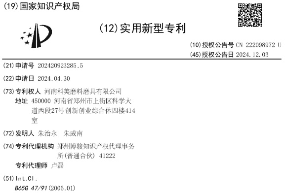 中国粉体网讯据国家知识产权局12?日信息显示,河南科美磨料磨具有限公司取得一项名为‛span style="color: rgb(192, 0, 0);">一种金刚石切割片上料装?/strong>”的实用新型专利,授权公告号CN222098972U,申请日期为2024?月、/p>