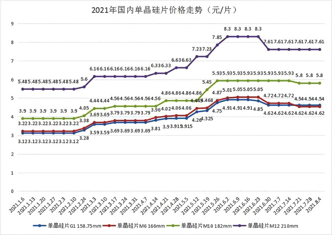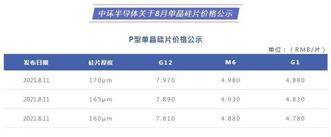 硅片方面??1日,中环股份公布8月单晶硅片定价,??7日公布的报价相比,M6每片上涨0.44元;相较?月报价,G12每片上涨0.44元,G1每片上涨0.26元、/p>