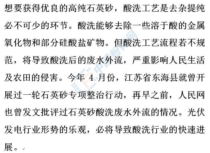 陈小平等在《高纯石英砂酸洗生产工艺技术探微》一文中,介绍了一种由传统的三酸混合饱和酸洗工艺改进采用单一酸不饱和半干加热酸洗工艺的先进性方法。他们在文末表示:“生产高纯石英砂采用单一盐酸不饱和提纯工艺探微技术社会效益显著,采用单一盐酸酸洗提纯高纯石英砂技术对环境保护起到了积极的推广促进作用,可实现节能降耗开创一条酸洗工艺技术探微的新路,为我国高纯石英砂酸洗生产工艺技术探索出了一个新的途径,使高纯石英砂生产工艺技术有新的突破“、/p>