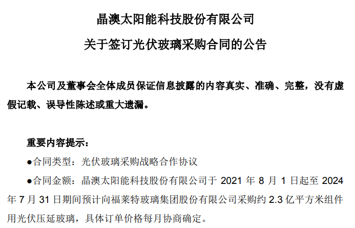 以光伏玻璃企业为例。近期,晶澳太阳能科技股份有限公司与福莱特玻璃集团股份有限公司签署光伏玻璃采购《战略合作协议》。协议约定,公司及公司指定的控股公司?021??日起?024??1日期间预计向福莱特及其指定的全资控股公司采购?.3亿平方米组件用光伏压延玻璃,具体订单价格每月协商确定、/p>