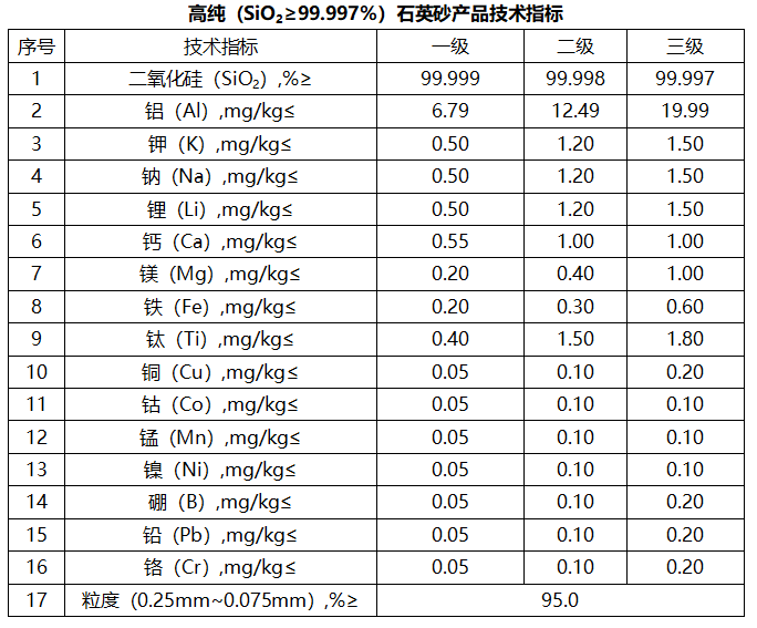 《重点新材料首批次应用示范指导目录(2018年版)《/strong>提出高纯石英砂,性能要求9strong>Fe、Mn、Cr、Ni、Cu、Mg、Ca、Al、Na、Li、K、B?2种元素总含野span style="color: rgb(192, 0, 0);">?ppm。应用领域:高品质石英制品、/p>