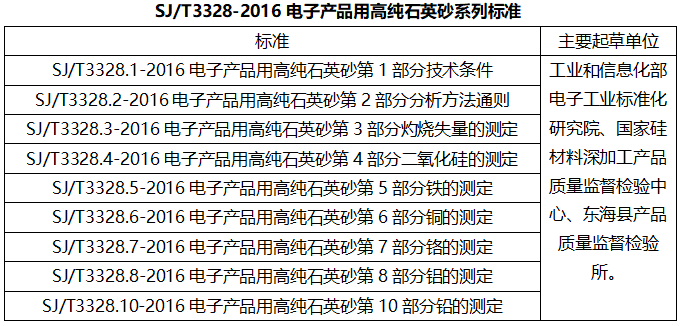 此外+span style="color: rgb(192, 0, 0);">行业标准SJ/T3328-2016电子产品用高纯石英砂标准中规定了电子产品的技术条件、分析方法通则、灼烧矢量的测定、二氧化硅的测定、铁的测定、铜的测定、铬的测定、铝的测定以及铅的测定、/p>