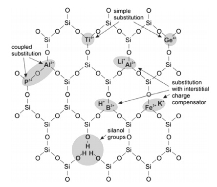 石英中晶体结构杂质分为晶格杂质和非晶格杂质,晶格杂质主要以他类原子以类质同象的方式取代硅氧四面体中的硅原子,主要杂质元素有Al3+、Ti4+、Ge4+等。这些杂质含量很低,但从石英中分离难度较大,是制约高纯石英质量关键性因素之一、/p>
