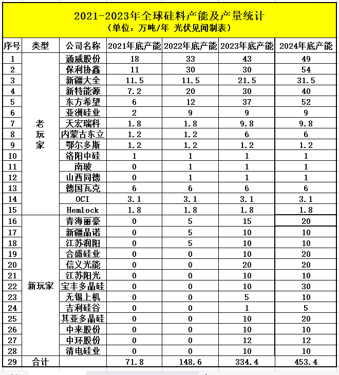 2021年以来,硅料老玩家大举扩产,新玩家实力雄厚如过江之鲫,这一轮硅料牛市涌现了将近30家硅料企业。光伏见闻根据公开消息不完全统计,2022年底,硅料企业新老玩家产能将达到148.6万吨?023年底,硅料企业产能则将达?34.4万吨,如果产能完全释放,保守估计这些硅料可生产的组件则分别为505GW?136GW、/p>