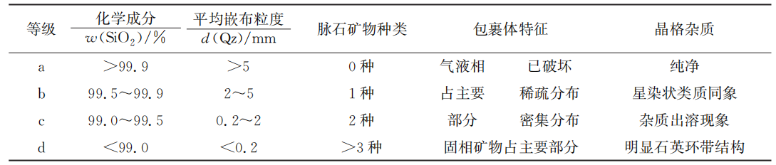 目前国内对于高纯石英没有统一的标准界定。国外学者主要根据石英中的有害元素含量对高纯石英进行分类。国内一部分学者仅基于SiO2的纯度对高纯石英进行分类;一部分学者则基于SiO2的纯度和有害杂质元素含量的上限对高纯石英进行分类。综合而言,大部分学者认为单靠化学成分来评判石英品质的优劣具有片面性,评价石英应综合考虑各种因素。就石英矿物本身而言,除了化学成分,天然石英中杂质元素赋存状态、石英嵌布特征、包裹体数量大小位置、晶格杂质等所决定的杂质可选性是判断高纯石英原料的重要标准、/p>
