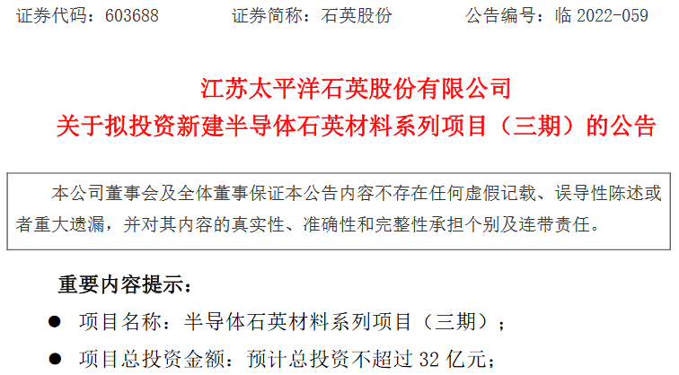 近日,石英股份公告称,为了抓住光伏及半导体产业的市场机遇,丰富产品结构,延伸产业链条,增强公司的市场竞争实力,助力公司持续健康发展,公司拟投资建设“半导体石英材料系列项目(三期)”,项目建设地点位于东海县平明镇内,经初步计算,总投资不超过32亿元。公告显示,本次项目建设内容包括6万吨高纯石英砂?5万吨半导体级高纯石英砂?800吨半导体石英制品,规划用地面积约245亩,建设周期三年?2亿元总投资中,固定资产投?0.8亿元,全额流动资?1.2亿元,资金来源为自有资金和自筹资金、br/>