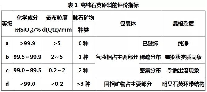 为了解决高纯石英砂原料的选择和评价问题,孙红娟教授课题组提出了一套科学可行的评价方法,具体涉及到化学成分、嵌布粒度、脉石矿物、包裹体和晶格杂质这?个关键评价指标,当石英原料在以上5个关键评价指标中?个及以上指标达到a级时(表1),可以推荐为高纯石英原料、br/>