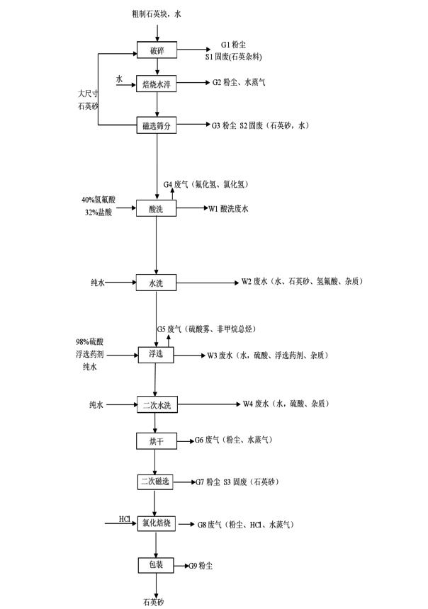 浮选、水洗:浮选采用多台浮选机串联,其中浮选剂、硫酸、纯水按照一定的比例进行浮选,本项目浮选采用多台串联工艺,所有浮选机都投加纯水,浮选药剂能够选择性的吸附在欲选的物质颗粒表面上,使其疏水性增强,提高可浮性,并牢固地粘附在气泡上而上浮,达到去除杂质的作用。最终浮选药剂位于溶液上层,和浮选杂质一起进入废水中。再经纯水进行水洗,直至清洗干净,提高产品高纯砂纯度、/p>