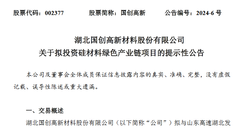 近日,国创高新发布公告,公司拟与山东高速湖北发展有限公司和湖北非金属地质公司共同发起设立项目公司,开发武穴市硅材料绿色产业链项目。本项目总投?0.5亿元,分两期建设。其中,一期投?0亿元,主要包括高纯石英砂、超细石英粉和大宗产品长石粉的研发和生产、br/>